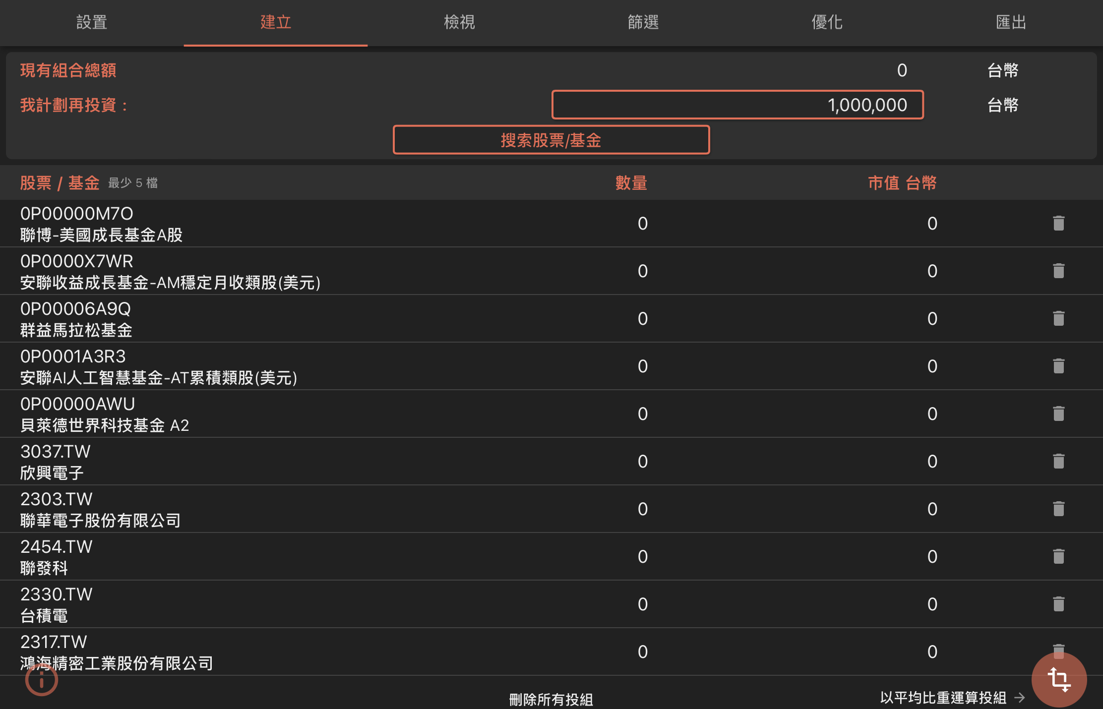 首先,在鉅亨AI投組,在『建立』選單中建構我們的投資組合,我們隨機挑選出5檔股票與5檔基金,分別為;