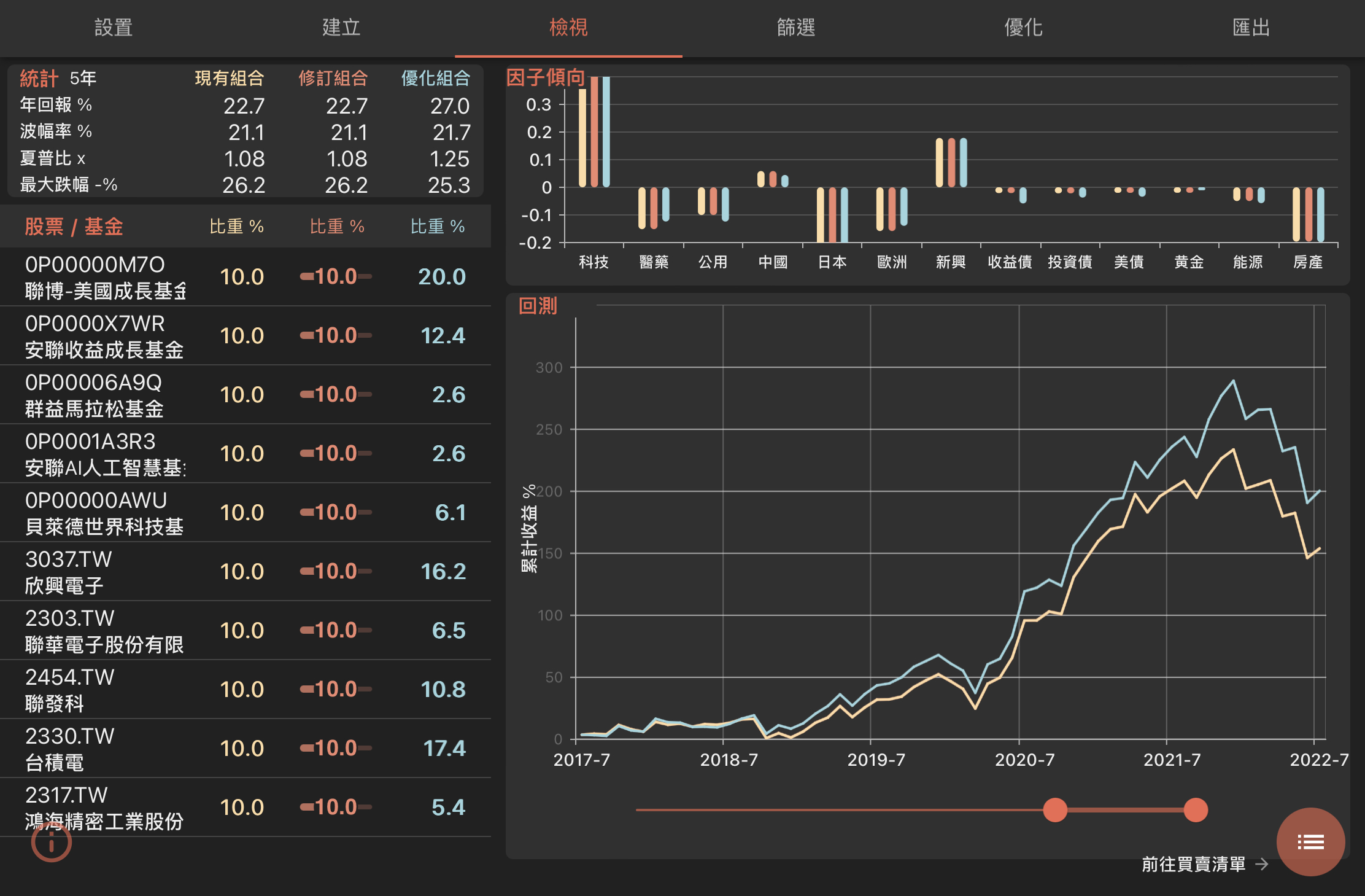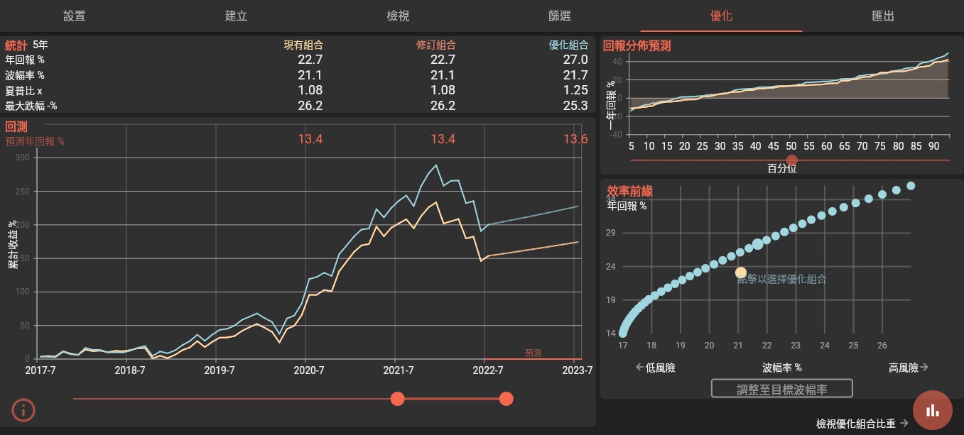 從優化後的回測數據,可以看到優化後的投資組合,其年回報、夏普比皆明顯高於原始投資組合。