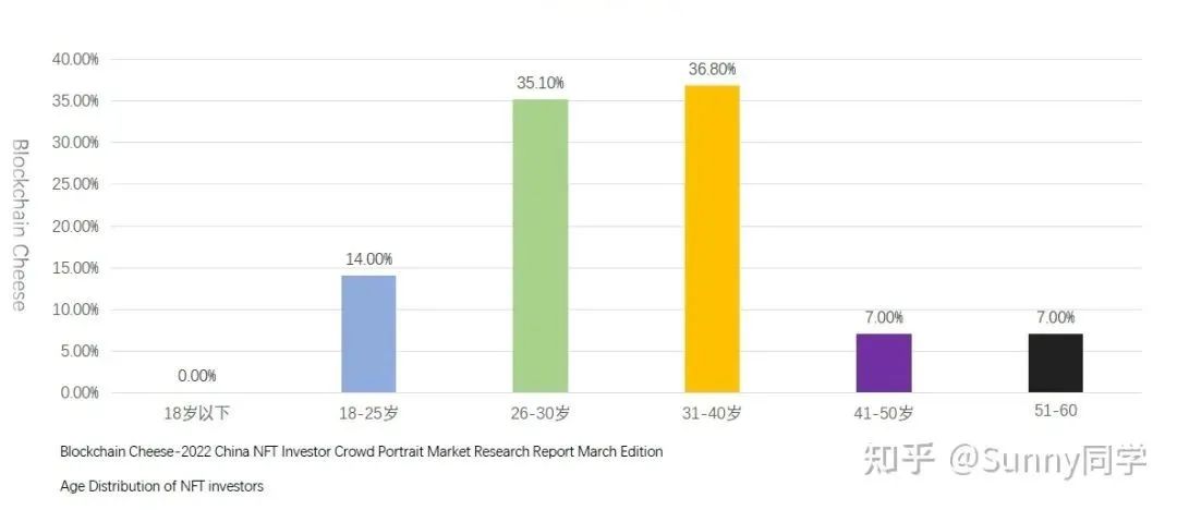 開啟NFT項目是品牌塑造年輕化形象的有效途徑。根據3月份“區塊鏈芝士”公佈的中國NFT買家用戶畫像調研分析報告顯示,NFT投資人群中佔比最高依次為31-40歲人群(36.8%)、26-30歲人群(35.1%)、18-25歲人群(14%),其中18-30歲年輕人群體成為消費主力。