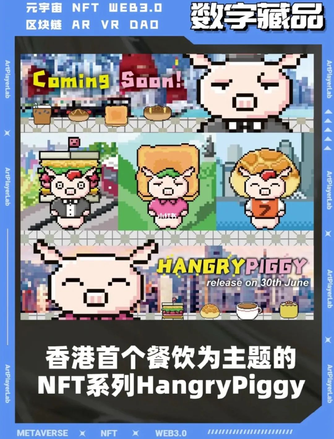 除了美食圖鑑的收藏功能之外,有品牌嘗試將數字藏品同線下美食的優惠權益結合起來。由發行公司HangryPiggy和香港創意營銷諮詢公司Elevate PR 共同創建的,香港首個以餐飲為主題同名NFT“HangryPiggy”於6月30日上線,公開發行1,997只Hangry Piggies數字藏品。發行方計劃與茶餐廳、街頭小吃攤、小吃店聯手,在展示香港飲食文化的同時,為NFT持有者提供優惠餐飲等獨家增值福利。