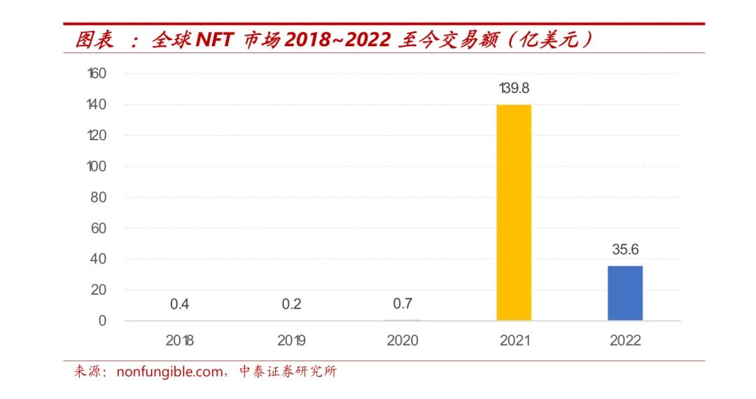 2021年被稱為“萬物皆可NFT”的“NFT元年”,這場最先由海外幣圈以圖文、影音、遊戲、藝術品等形式掀起的金融風暴使得人們似乎看到了“元宇宙”的未來。根據中國中泰證券研究所數據顯示(截至2022年2月14日),在2021年全球NFT市場交易額迎來139.1億美元的爆發式增長後,2022年1、2月熱度絲毫不減,仍擁有巨大的增量空間。