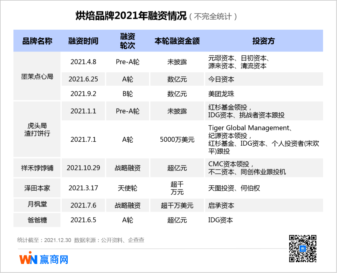2021年,資本瘋狂湧入烘焙賽道,全年共有6個烘焙品牌累計獲得9輪融資,其中墨茉點心局、虎頭局分別斬獲3輪、2輪融資。資本野性投資,品牌身價飆升,墨茉點心局甚至單店估值約1億元。