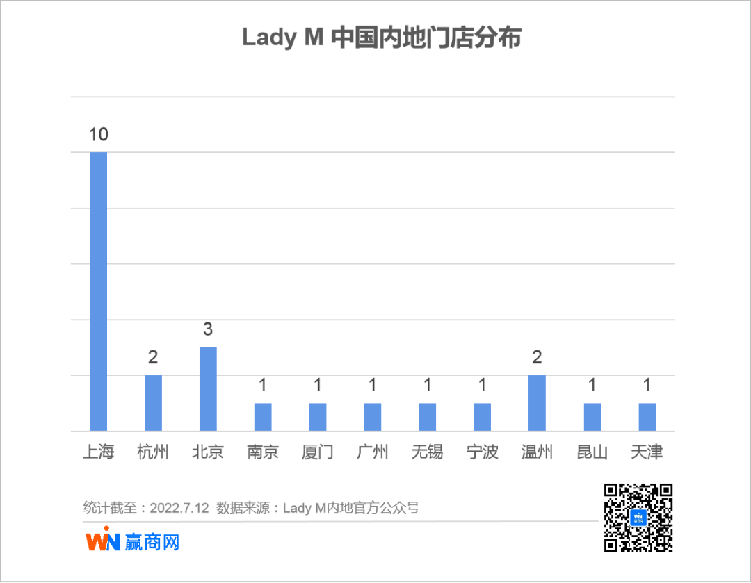 根據“Lady M內地官方”公眾號顯示,目前其總計有24家店。其中,上海10家,佔比近50%。