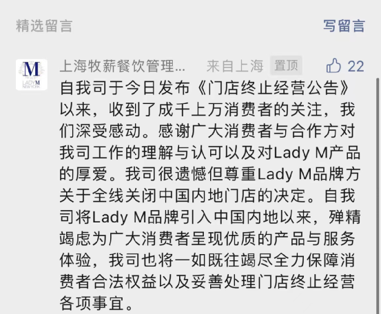 而在最新的回應中,“上海牧薪”在原公告一文評論區表示,“自我司將Lady M品牌引入中國內地以來,殫精竭慮為廣大消費者呈現優質的產品與服務體驗,我司也將一如既往竭盡全力保障消費者合法權益以及妥善處理門店終止經營各項事宜。”