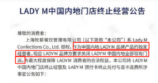 這則聲名落款是Lady M的中國內地獨家代理方“上海牧薪餐飲管理有限公司”。