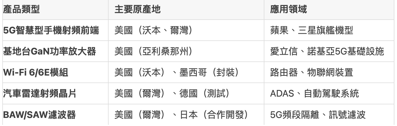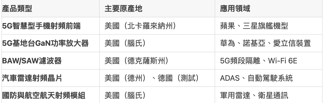 - 主要原產地:Qorvo絕大部分射頻晶片的原產地為美國,核心製造環節集中在北卡羅來納州、德克薩斯州和板州的晶圓廠。