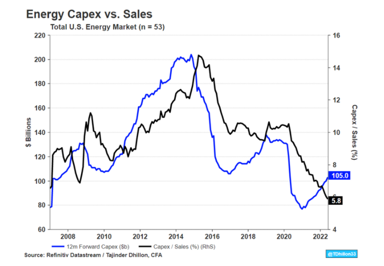 我們看到上圖中美國能源資本開支/銷售額的比例,對應的數字還在下降,也就是資本開支增幅依然小於油價上漲驅動的收入,而在10-14年,這個數字一直在增長,增加到14%左右,供需關係逆轉,持續了4年的高油價才終止,capex比sales的比例回升且維持一段時間,才能看到供需關係的改變,所以目前來說,供需關係的平衡還有很長的路要走。
