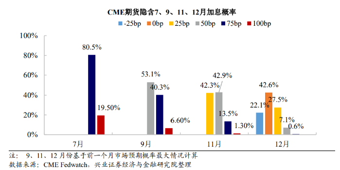 市場預期7月大概率加息75bp,明年初或將開始降息。超預期的6月通脹數據公佈後,市場一度交易7月FOMC會議加息100bp,但聯儲預期引導以及上周不及預期的房地產等經濟數據公佈後,市場加息預期大幅降溫。當前大多數市場參與者定價7月加息75bp,期貨隱含2022年全年加息318bp,較上周預期加息幅度有所收窄。對於年內未來的幾次FOMC會議加息路徑,市場預期加息幅度將逐漸緩和,到12月或將停止加息(市場預期12月加息概率已不及50%),而2023年初或將開始降息。