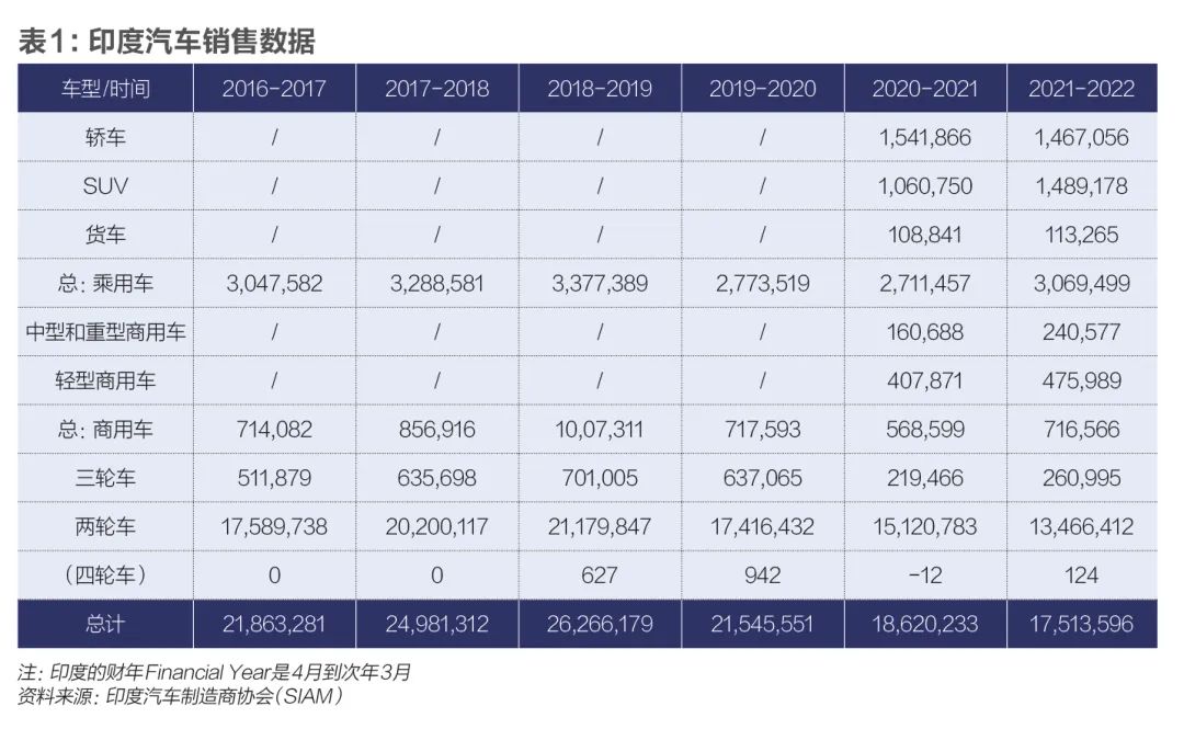有趣的是,與其他國家不同,印度在統計本國汽車銷量時,往往會將兩輪車、三輪車一併計入。比如印度汽車製造商協會(SIAM)的數據顯示,印度2021-2022財年累計銷售汽車(實為機動車)1751.35萬輛,其中兩輪車1346.64萬輛、乘用車306.94萬輛、商用車71.65萬輛。