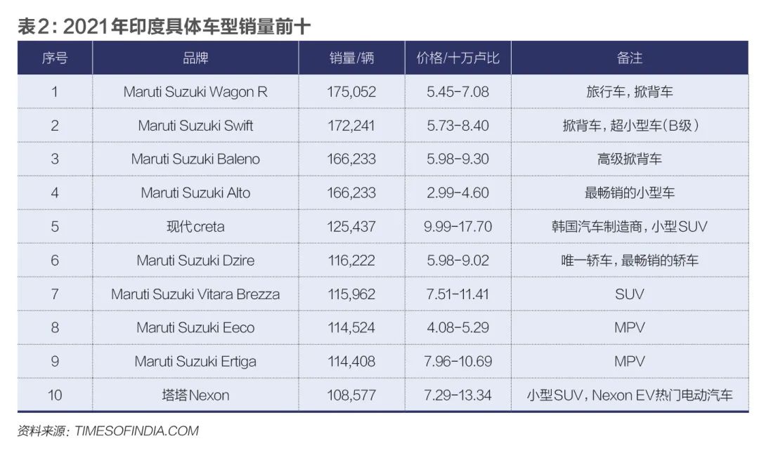 2021年,馬魯蒂鈴木以136.47萬輛的壓倒性優勢成為印度的銷量冠軍,八款車型進入銷量榜前十,更包攬銷量前三:Wagon R(17.5萬輛)、Swift(17.2萬輛)和Baleno(16.6萬輛),都是小型兩廂掀背車,價格在50.4萬盧比到90.3萬盧比(相當於4.3萬元至7.8萬元人民幣)。