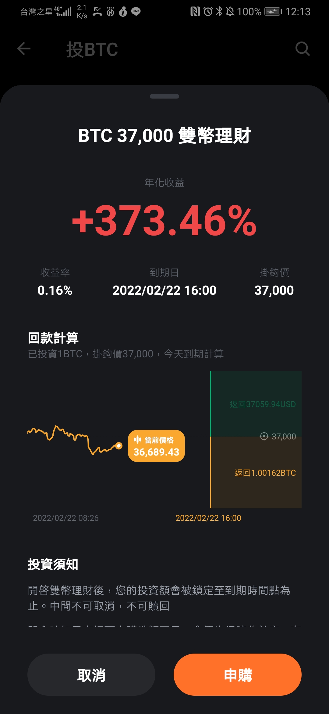 如果當天結算沒有漲破結算價(示意圖是37000),你就可以領取年化373.46%的利息!!