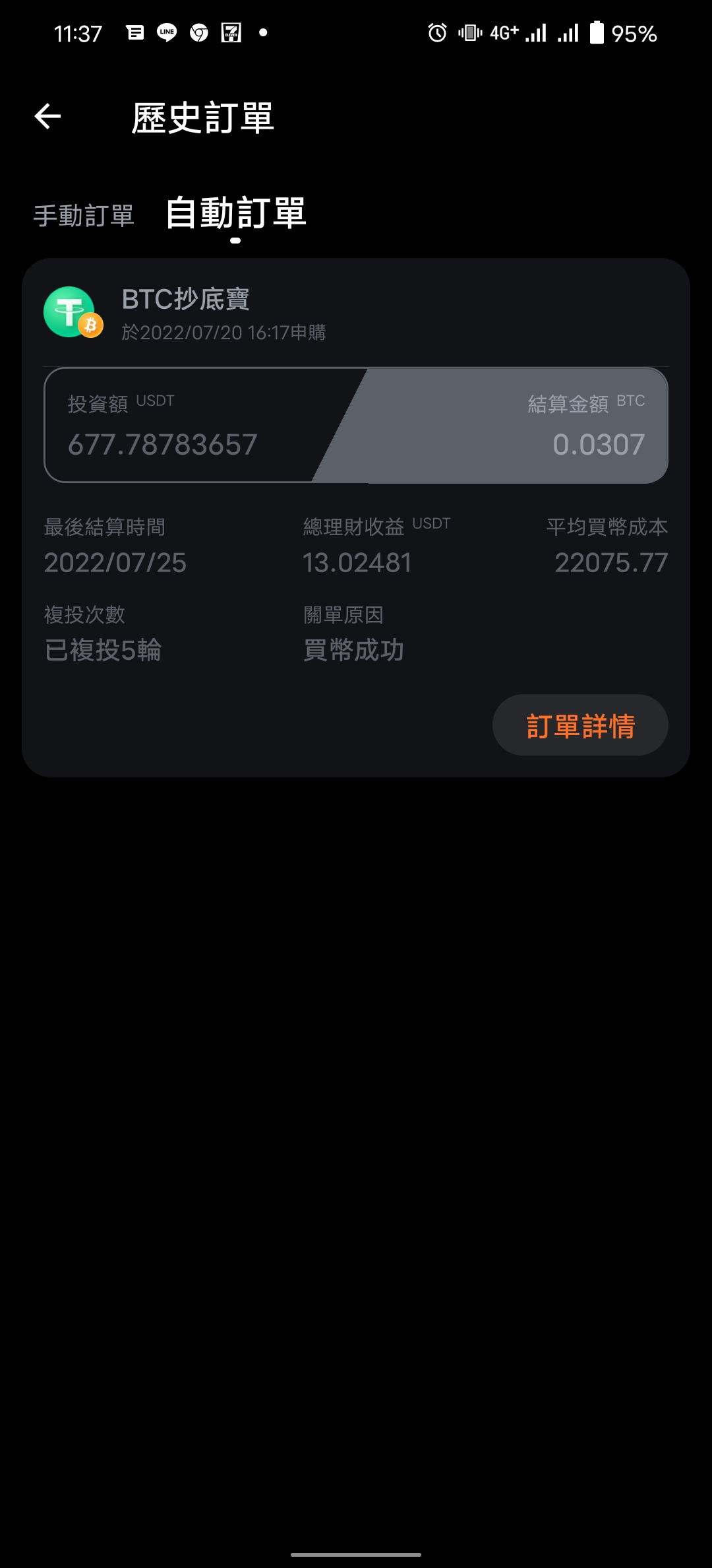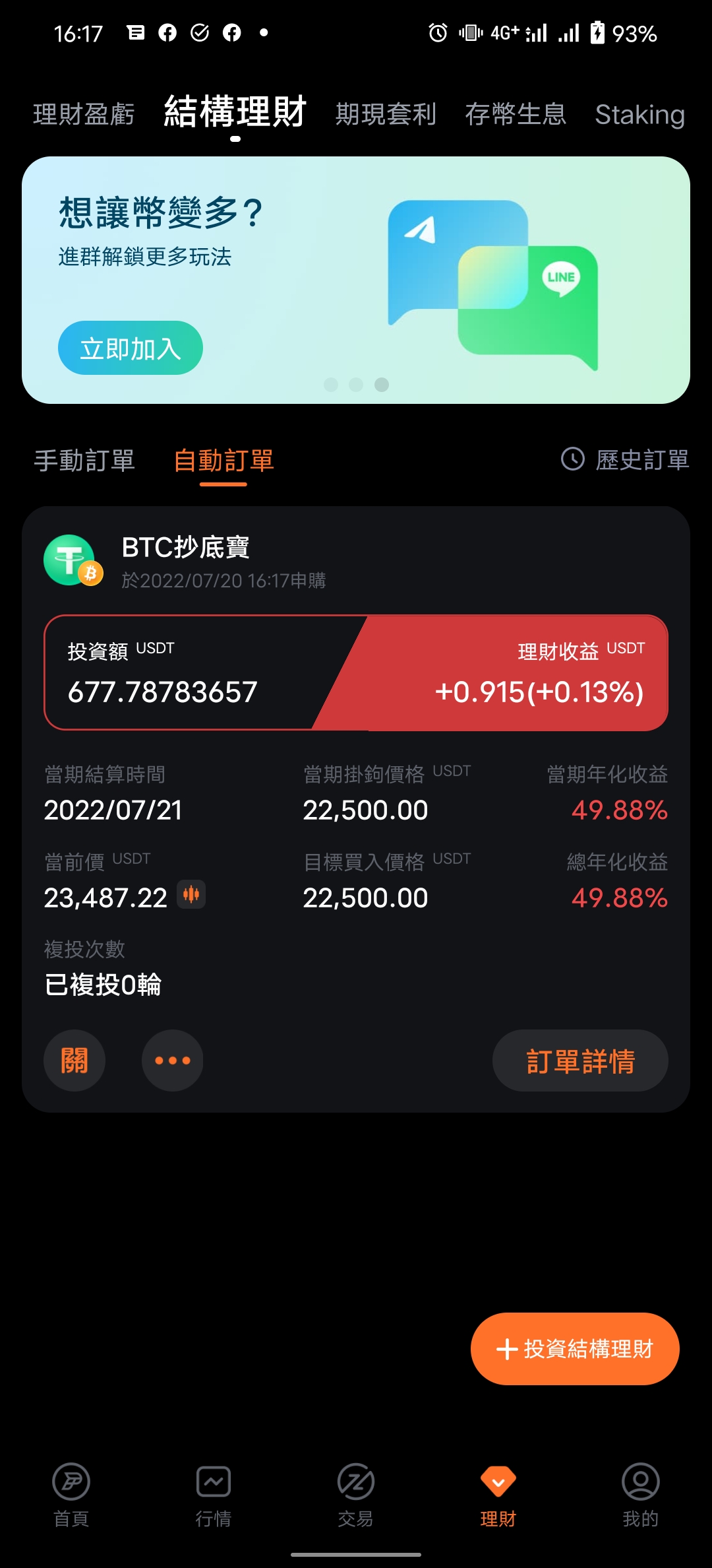 所以我就使用雙幣理財中的自動復投買幣的工具~抄底寶!!