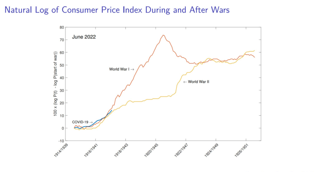 “2020年12月到2022年6月,美國CPI走勢與一戰和二戰期間的軌跡是一樣的。”薩金特表示,這解釋了為什麼美國現在通貨膨脹並不像2021年春天,美聯儲和拜登總統的經濟顧問委員會期待的那樣是過渡性的。