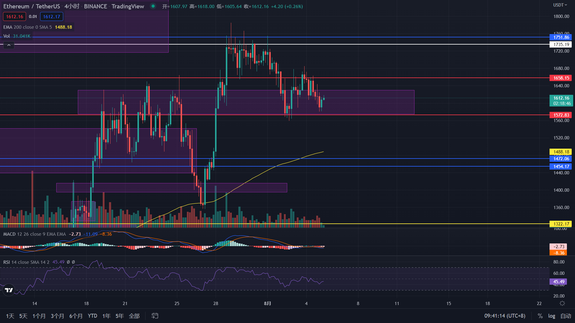 從天圖的角度來進行分析,乙太幣價格回到前日的價格最低的位子后立即遭到拒絕並回漲至上方。 此外,昨日也提到價格可以在上漲到1660美元左右可以進行空單的操作,也跟預期的一樣先上漲後繼續下跌回落 至支撐位。 今日的價格仍將會以小幅上漲為主要浮動並且可以在價格來到1570左右進行多單的操作。 昨日乙太幣的最高價格為1662,最低價格為1580以及收盤價為 1607美元左右且跌幅高達0. 63%。 今日的支撐位仍為1629-1570美元左右,阻力位為1735美元左右。