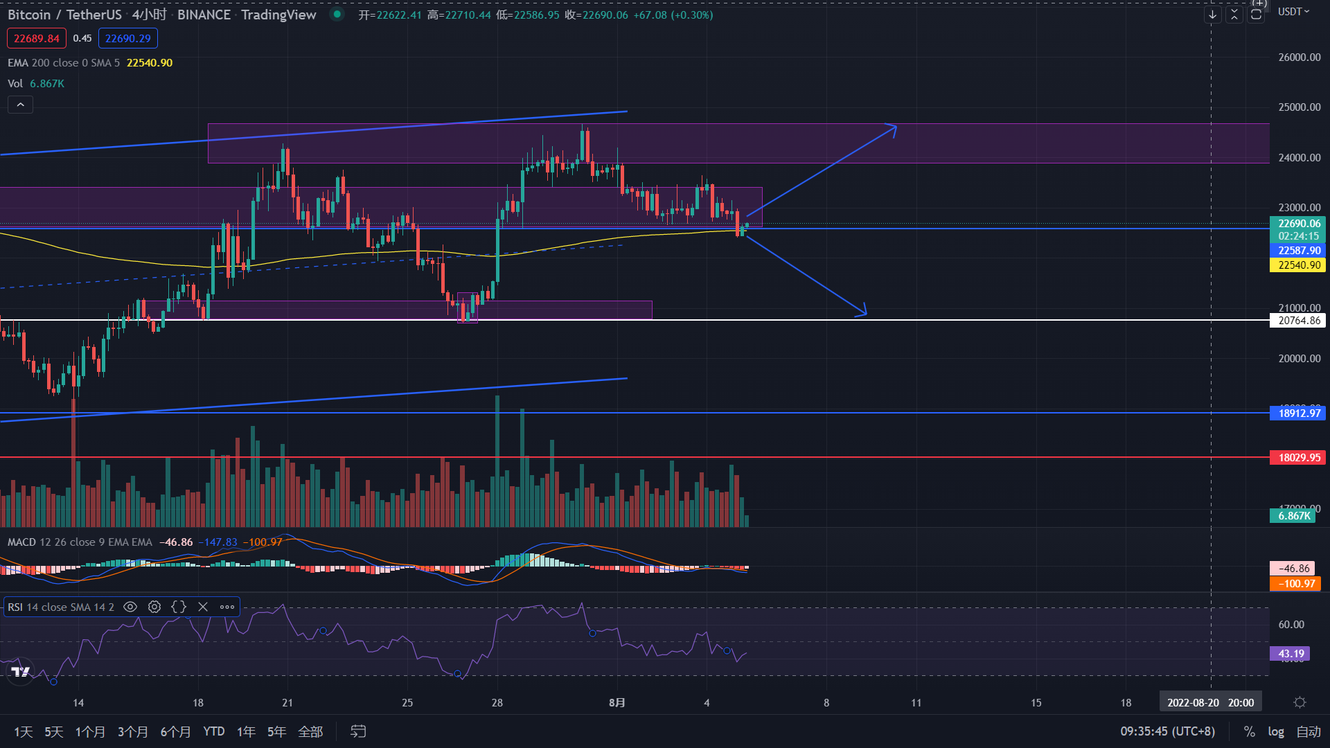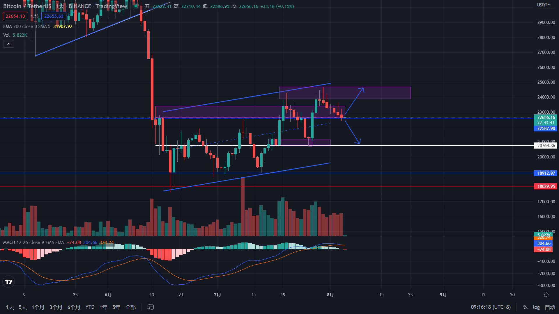 從天圖的角度來進行分析, 比特幣價格仍未跌破支撐位區間仍需等待。 現價格22656美元左右。 根據昨日的直播以及報告有說明價格會以下跌為主並在區間位之間23417-22610左右 進行震蕩,並且價格也如預測的下跌回落至區間后立即遭到拒絕往上回調且最高23223美元左右。 今日的價格仍將會以小幅上漲為主要浮動。 昨日比特幣的最高價格23223,最低價格為22400以及收盤價為22622美元左右且 跌幅為0. 86%。 今日的大支撐位仍為20800-21150美元左右,小型支撐位為22610或是20800 美元左右可以選擇做多,大阻力位為23900-2 4700美元左右。