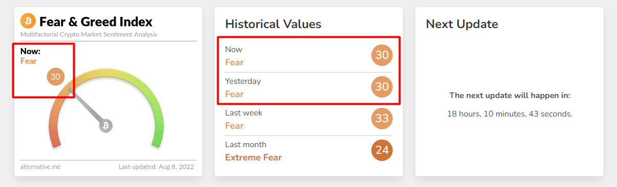 當前恐慌與貪婪指數:30(24小時前爲30),等級爲恐慌。