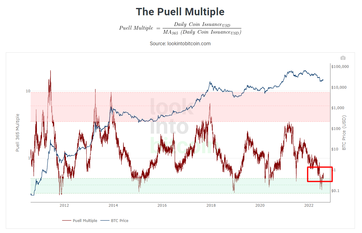 注:皮勒乘數計算「當前礦工營收和過去 365 天平均的比值」 公式如下:皮勒乘數 = 礦工收益(新發行比特幣市值)/ 365 天移動平均礦工收益(皆以美元計價)若皮勒乘數遠低於 1,表示礦工利潤增長的動能不足,價格將探底,高機率出現價格底部(綠色區域);反之,皮勒乘數大於 1,則表示礦工仍有利潤增長的動能,價格將上升,高機率出現價格頂部(紅色區域)。(數據來源:lookintobitcoin.com)