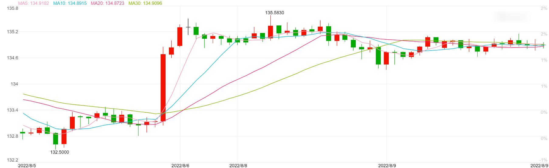 從日線圖上觀察,美日目前受壓於20日均線下方,行情走勢也頗像是大幅拋壓過後的一種反彈修復。是二次拉升,還是延續獲利回吐向下行走,則要留意本週三美國CPI數據的表現狀況。日內留意135附近的阻力,若向上突破,則有望繼續向前期高點進發。而受阻的話,獲利回吐行情將延續。