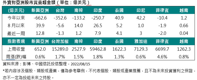 美國7月消費者物價指數(CPI)年增率降至8.5%,新興亞股上周全面漲升反映通膨降溫,其中以菲律賓漲幅最多,單周上漲4.6%,印度漲幅1.8%居次,台股1.7%排第三;綜觀上周資金流入最多的前三新興亞股為印度、泰國、印尼,金額分別為7.9億美元、4.1億美元及3億美元,台股連2周淨流出、南韓連6周淨流入、越南與印度皆連4周淨流入。
