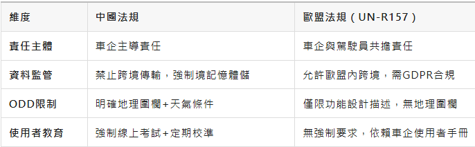 - 資料黑匣子:強制安裝車載事件記錄系統(EDR+),儲存事故前30秒的 系統狀態、駕駛員行為、環境感知資料。