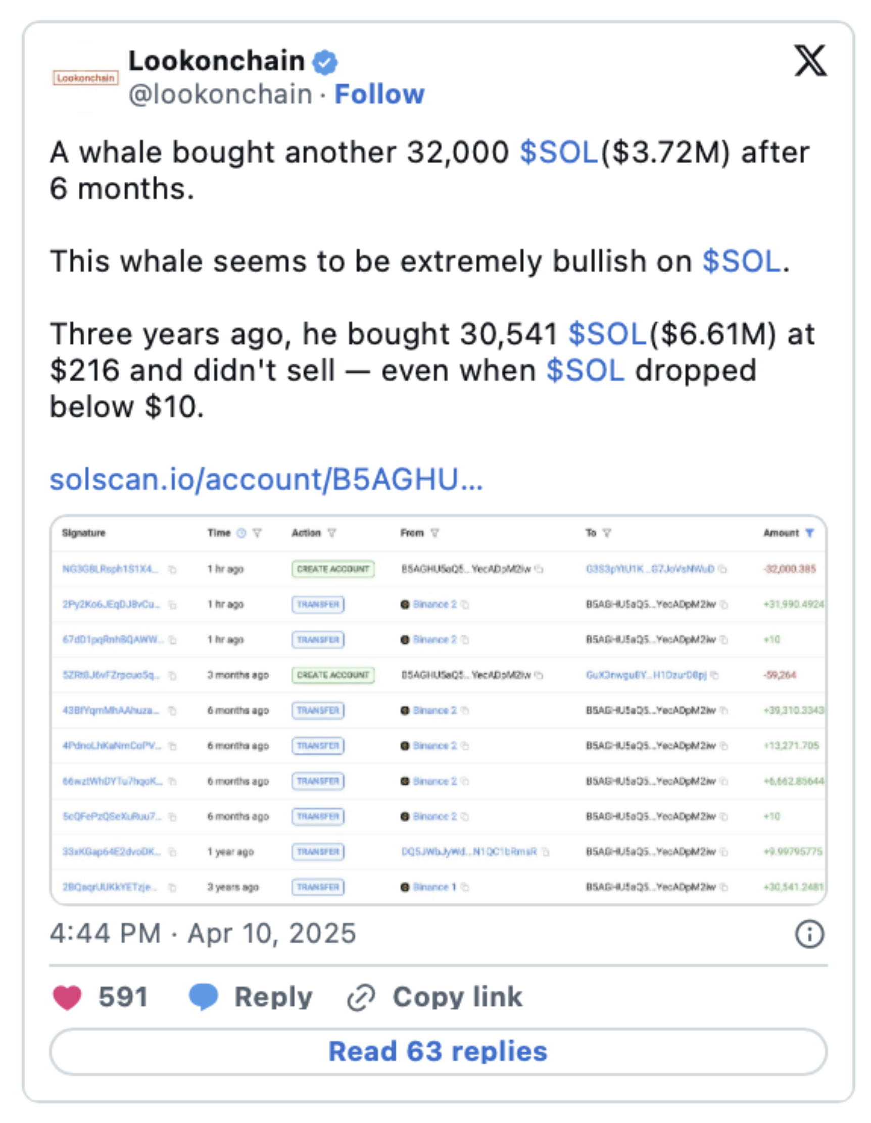 2025年4月14日(星期一)——一位極度看好Solana($SOL)的巨鯨在加密市場低迷之際出手,大手買入32,000枚$SOL,當時價值約為372萬美元。