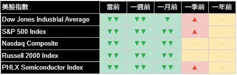 主要指數大幅收低,標普500指數下跌-2.24%,收於5,275.70點,道瓊工業指數下跌-1.73%至39,669.39點,那斯達克綜合指數暴跌-3.07%至16,307.16點。代表小型公司的羅素2000指數表現略為堅韌,下跌幅度較小,為-0.96%。因半導體股受到對中國出口新的限制,科技股為主的費城半導體指數受到特別嚴重打擊,暴跌-4.14%。