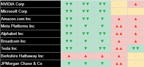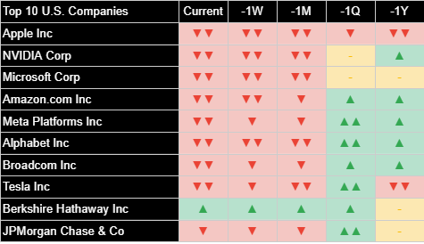 美國市值最大的公司基本上反映了大盤的下跌趨勢,其中科技巨頭領跌。按市值計算的十大美國公司中有九家出現虧損,僅波克夏海瑟威例外,小幅上漲+0.12%。大型科技股的下跌幅度表明,投資者正在重新評估這個近年來主導市場表現的行業的成長預期。