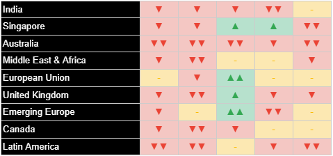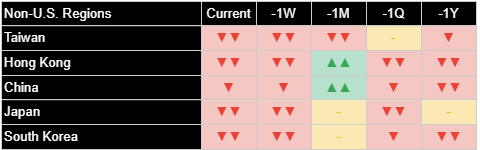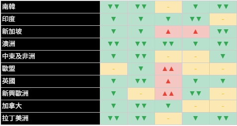 全球市場週三普遍疲弱,大多數地區與美國市場同步下跌。亞洲市場受到特別嚴重打擊,隨著貿易緊張局勢升級,中國下跌-2.01%。歐洲市場表現不一,一些地區相對於美國市場展現出些許韌性。拉丁美洲表現出相對強勢,小幅上漲+0.17%,表明一些新興市場可能受益於從較發達地區的資本流出。