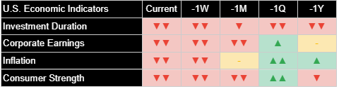 Economic indicators displayed broad deterioration, suggesting increased stress in the overall economic environment. Investment duration showed significant weakness across all time frames, indicating mounting concerns about long-term growth prospects. This persistent deterioration aligns with Federal Reserve Chair Powell's cautious stance on the economic outlook. Consumer strength also showed substantial deterioration, reflecting growing uncertainty about household spending power in the face of potential inflation pressures from tariffs.