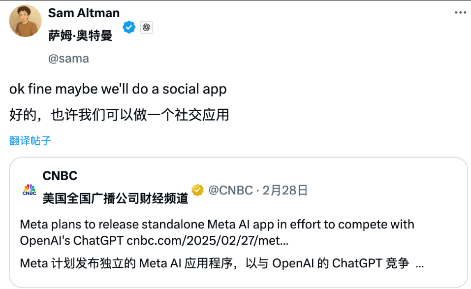 一方面,此前有傳聞稱,Meta 計畫推出獨立的 AI 應用,並計畫將其與社交資訊流結合,當時 Altman 在 X 平台發文暗示:「那好,我們也可能開發一款社交應用。」