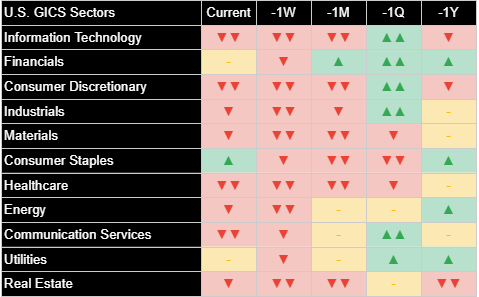 儘管今日有所上漲,大多數類股在目前、一週和一個月時間框架內的趨勢模式仍普遍呈現負面。然而,必需消費品在多個時間框架中展現出更具建設性的模式,從一週和一個月的角度來看,可見正面走勢。防禦型類股的韌性與更廣泛市場的技術性挑戰之間的這種差異暗示,儘管今日出現反彈,投資者仍保持謹慎。接下來幾個交易日將對確定這次反彈是否代表可持續復甦的開始或僅僅是持續調整中的技術性反彈至關重要。