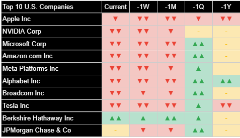 Examining trend patterns, most of the largest companies continue to show negative trends across current, one-week, and one-month timeframes despite today's gains, reflecting the significant technical damage inflicted during the recent market downturn. Notably, Berkshire Hathaway stands out with more constructive patterns, showing positive current readings and strength visible in longer-term views. This divergence highlights the value of Berkshire's diversified business model and substantial cash reserves during uncertain market periods, characteristics that investors have increasingly valued amid recent volatility.