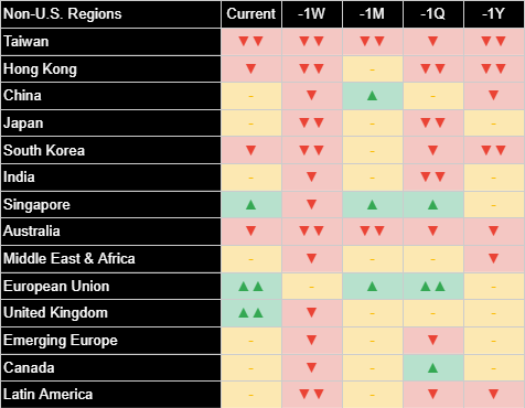 Corporate earnings measures have shown positive movement in the daily timeframe, reflecting recent solid earnings reports and perhaps indicating that market concerns about earnings impacts from trade tensions may have been somewhat overdone. The one-quarter view remains positive, underscoring the generally healthy corporate environment that existed before recent policy uncertainties emerged. Consumer strength shows persistent weakness across most timeframes, suggesting ongoing concern about how trade dynamics might affect household spending patterns despite today's market optimism.