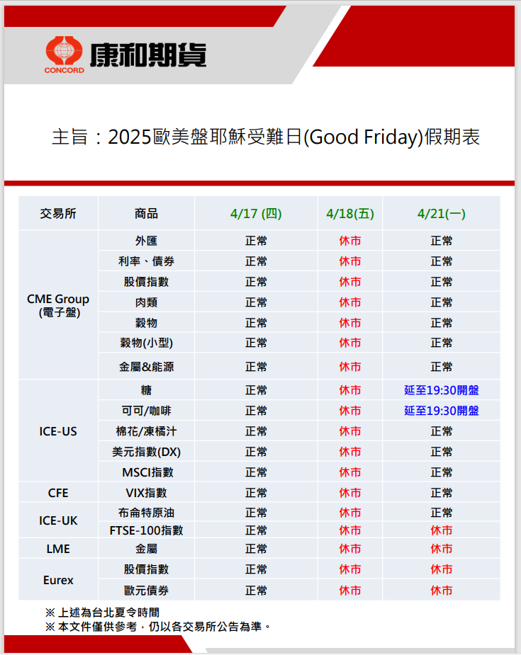 耶穌受難日歐美盤海期休市,請投資人留意假期交易風險