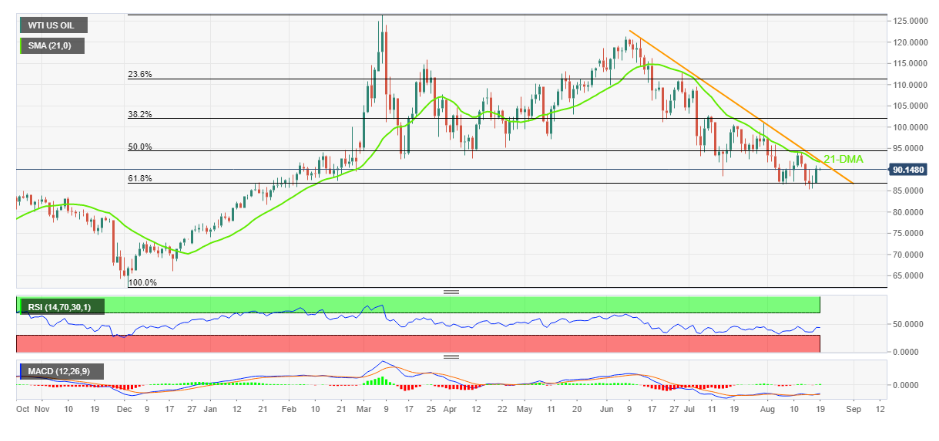週四,WTI油價錄得一個月以來最大單日漲幅,同時自2021年12月至2022年3月升勢的61.8%斐波回檔位86.85美元反彈。不過值得注意的是,油價仍位於21日MA均線和6月中旬以來的下降趨勢線92.00美元下方。