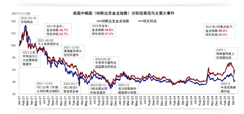 儘管市場短期可能對關稅本身的稅率數字逐漸「脫敏」,但美國在除關稅以外其他領域的威脅或對抗也不斷出現。其中,近期美國財政部長貝森特威脅稱不排除將中國企業股票從美國交易所退市的可能。