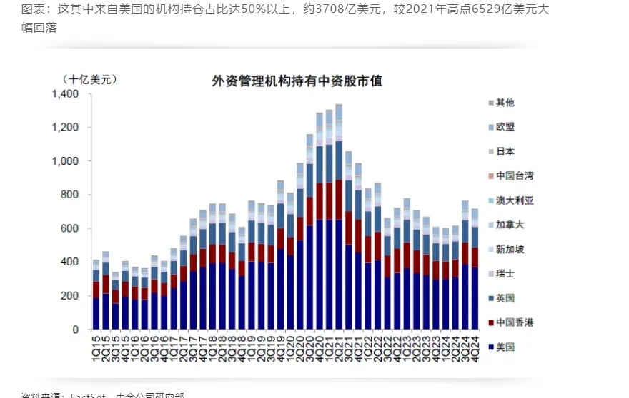 相比美國財政部的口徑,中金公司通過自下而上的方式彙總不同類型機構投資者持倉情況。其彙總全球超3100家主要資管機構持倉中(主動+被動),截至2024年底持有中資股市值約7171億美元,其中美資機構佔比51%,爲3,708億美元,較2020年底高點的6,529億美元下滑43%。
