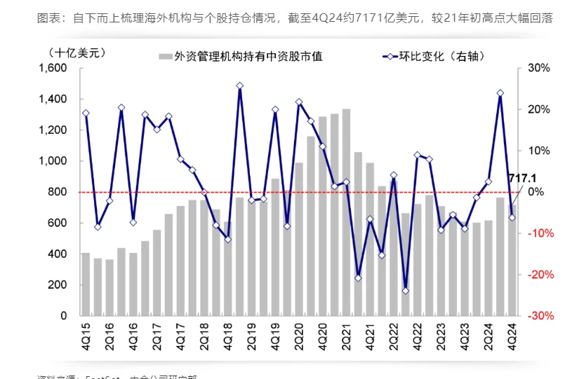 考慮2023年底以來MSCI中國指數反彈23%,不考慮這一期間增減持的話,中金預計持倉規模可能達到7000-7500億美元。不過,由於投資者通過一些其他方式持股(如離岸金融中心等)或許無法被完全捕捉到,實際規模可能更高。