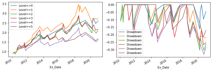 而5日漲跌指標>=4時進場,報酬率則受到很大的影響,年化報酬率僅有4.7%,遠差於5日漲跌指標=0時的9.1%。