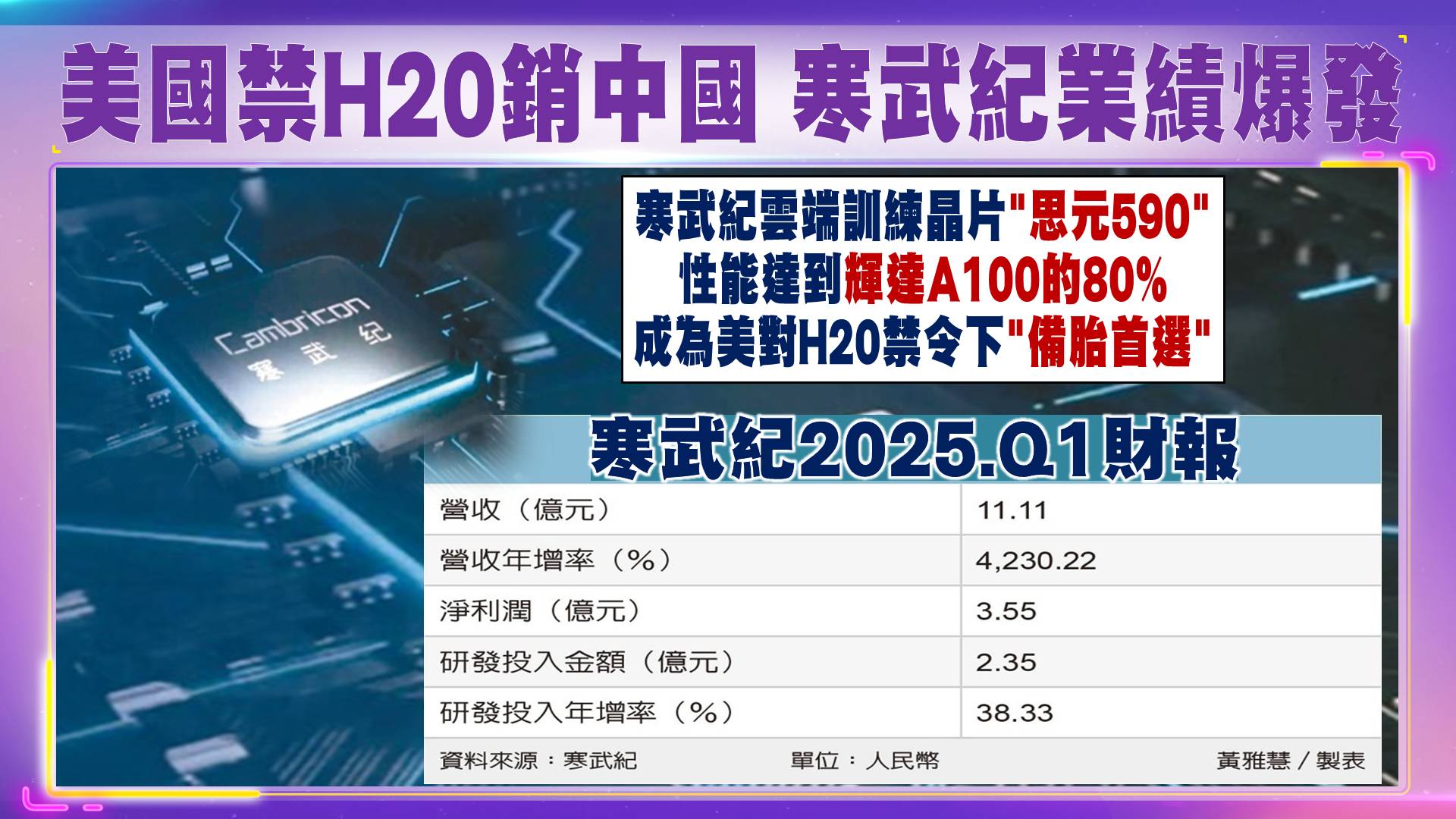 市場人士分析,美國晶片禁令下,寒武紀思元590(性能達輝達A100的80%)成為「備胎首選」。最近,輝達連向中國大陸市場定制的H20都被美國限制了,可以預見,寒武紀產品短期內需求會更加旺盛。