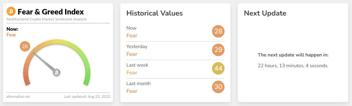 當前恐慌與貪婪指數:28(24 小時前爲 29),等級爲恐慌。