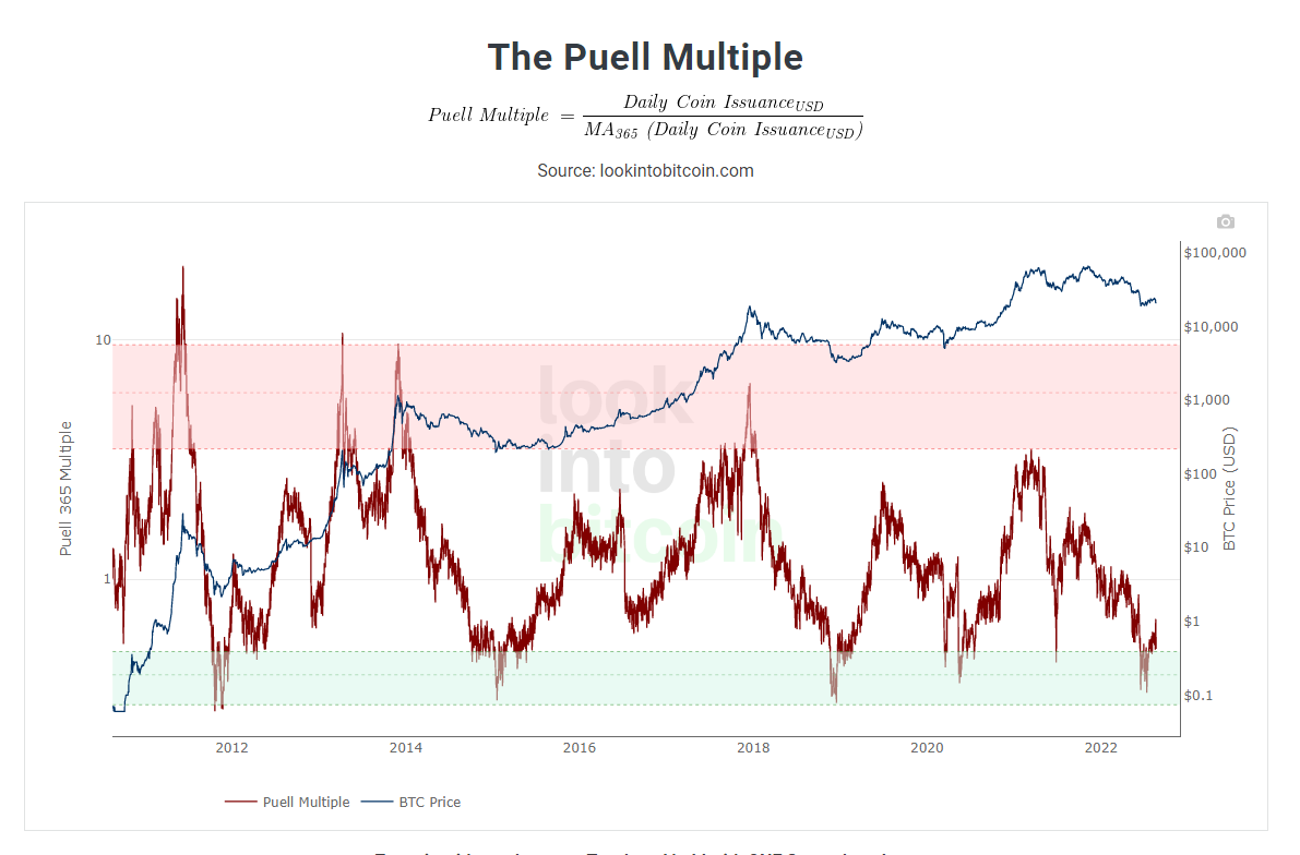 注:皮勒乘數計算「當前礦工營收和過去 365 天平均的比值」 公式如下:皮勒乘數 = 礦工收益(新發行比特幣市值)/ 365 天移動平均礦工收益(皆以美元計價)若皮勒乘數遠低於 1,表示礦工利潤增長的動能不足,價格將探底,高機率出現價格底部 (綠色區域);反之,皮勒乘數大於 1,則表示礦工仍有利潤增長的動能,價格將上升,高機率出現價格頂部 (紅色區域)。(數據來源:lookintobitcoin.com)
