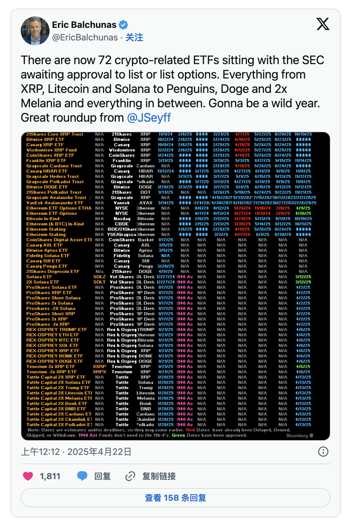 目前SEC正在審查72份各類加密ETF的申請,像彭博社的Eric Balchunas等業內人士預期,其中不少有望獲得批准。