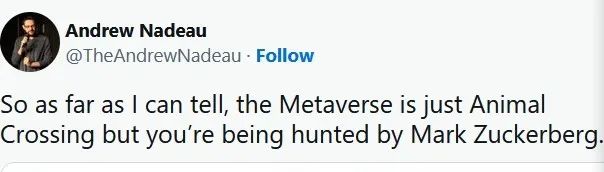 CEO發布的產品截圖,並沒能成為很好的宣傳,反而讓人越想越害怕、想著想著就“飽”了,喪失嘗試的興趣:“據我所知,元宇宙其實就是動森,只不過你在其中被馬克·左克伯追殺。”一位網友在推特打趣道。