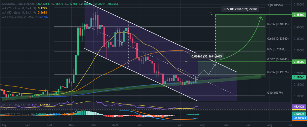 若買盤動能得以維持,DOGE一旦實現有效突破,或將衝擊0.48美元,較目前價格潛在漲幅高達160%。