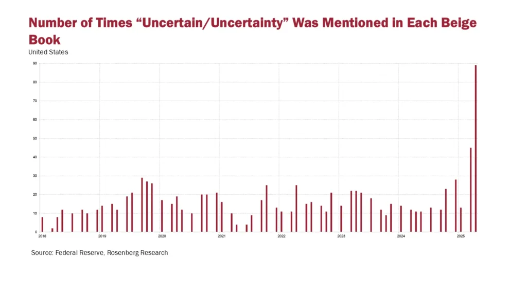 經濟成長侷限於少數地區與產業,企業僱用意願明顯放緩,部分產業出現裁員醞釀,同時在價格轉嫁受限的情況下,企業利潤逐步被壓縮。此外,《褐皮書》中與「關稅」與「不確定性」相關的關鍵字頻率明顯異常升高,反映企業對政策風險的感知正在急劇升溫。