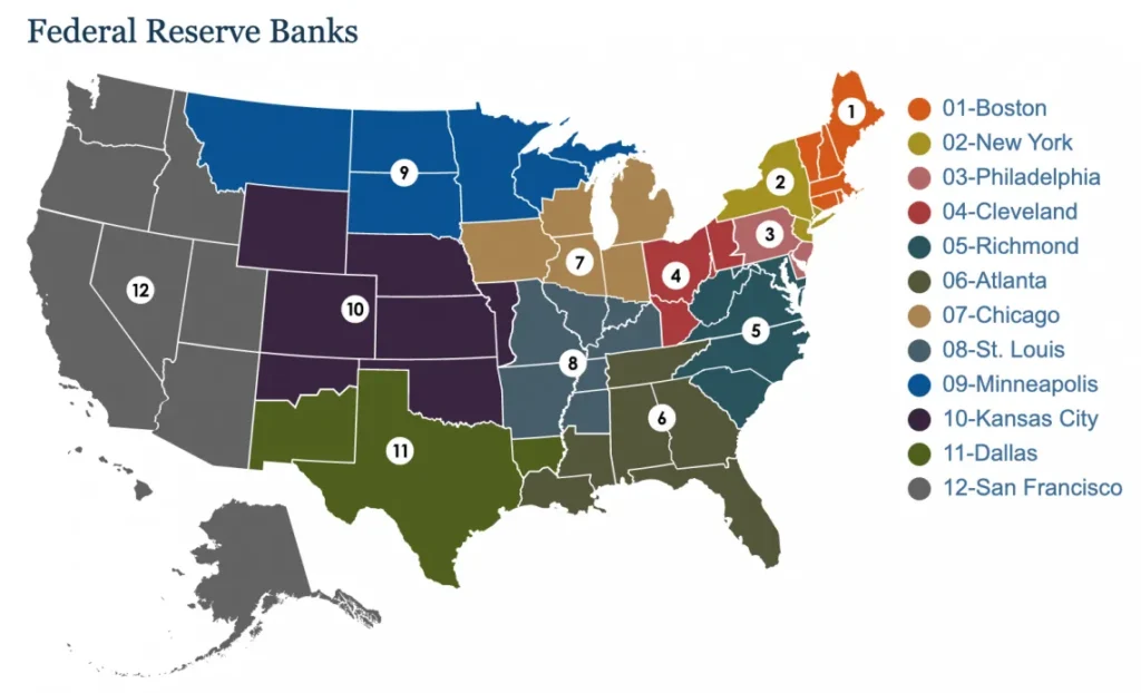 圖(一):12 個 FED 地區分行根據自己負責的區域進行經濟調查與研究(Source: The Federal Reserve)