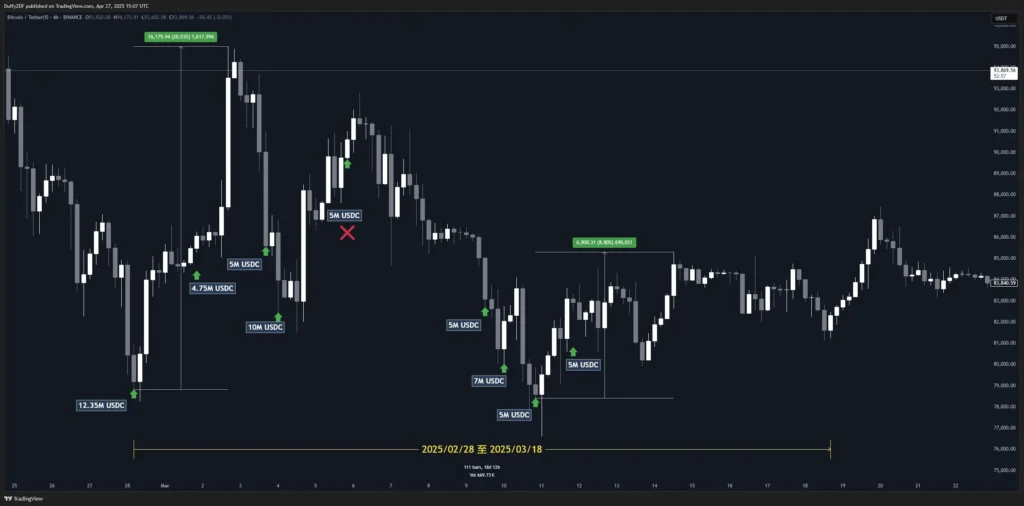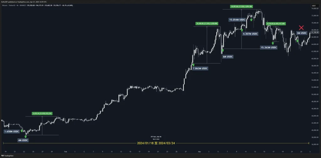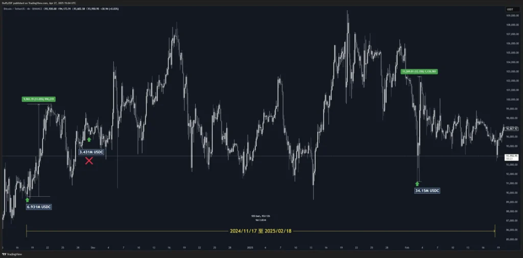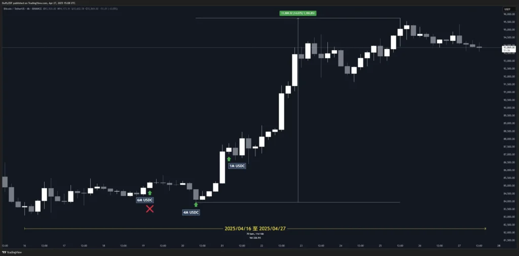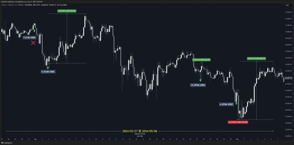 具體而言,當 USDC 突然解押並高速流入交易所,往往代表市場大戶已備妥後續買盤;此時若伴隨整體資金氛圍偏多,則暴漲機率顯著提升。相反地,若整體市場趨勢偏弱或有人為利空擾動,單一大額入金可能因買興不足而「失效」。因此,將 USDC 大額轉入視為判斷市場情緒的有力輔助指標,仍應與成交量、持倉量及行情趨勢等其他技術與基本面訊號交叉驗證。