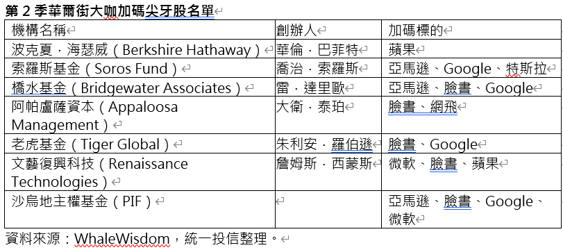 統一FANG+ETF(00757)經理人袁永騰表示,FANG+指數成分股皆為科技巨頭,擁有雄厚現金流及持續成長的產業前景,且今年以來受到聯準會升息影響,評價遭到大幅修正。成長趨勢確立,加上誘人的評價,使多位華爾街大咖們在第2季,不約而同地選擇抄底尖牙股。攤開第2季加碼尖牙股的大咖名單,會發現沙烏地主權基金、金融大鱷索羅斯、避險基金巨頭達里歐、抄底王大衛.泰珀、金融投資大師朱利安.羅伯遜創辦的老虎基金、知名量化對沖基金文藝復興科技等,都赫然在列。而持股變動向來不大的巴菲特,其創辦的波克夏海瑟威,也在第2季大幅加碼他最愛的蘋果公司。