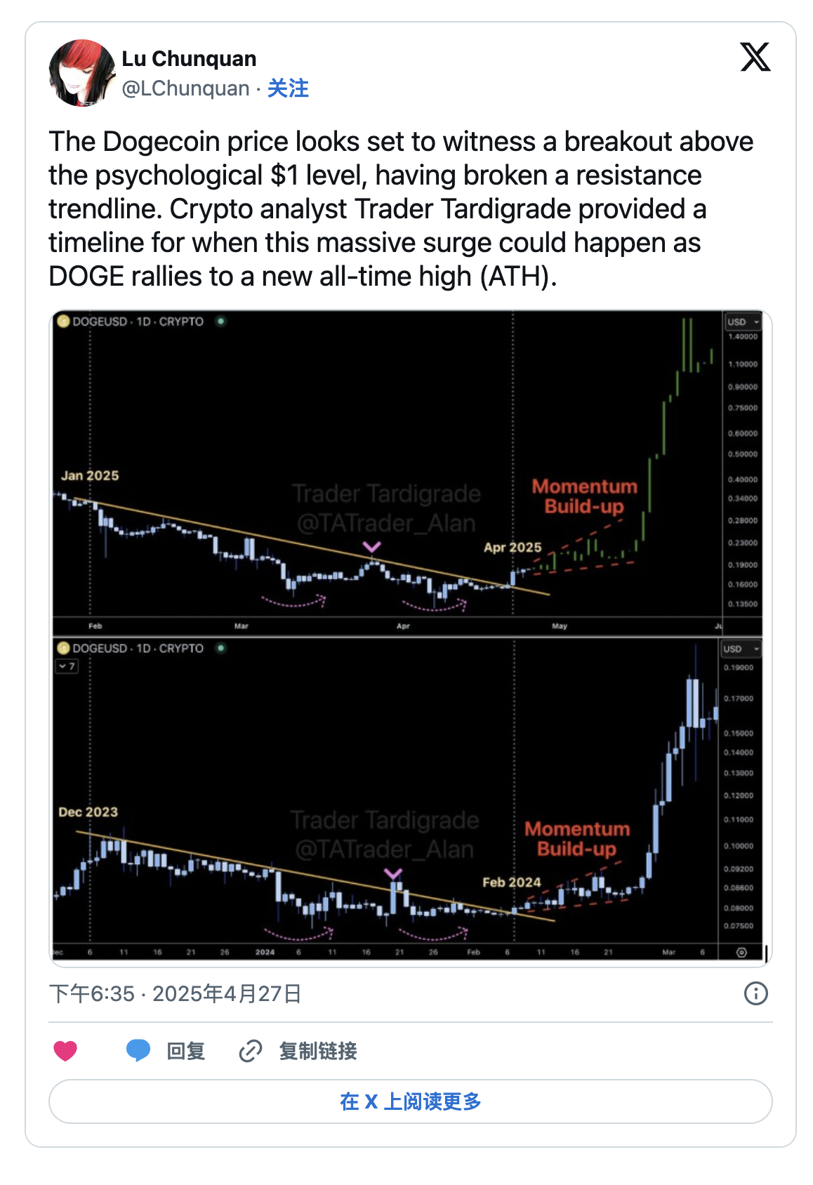 包括Trader Tardigrade在內的市場分析師認為,Dogecoin可能重現歷史性大漲行情,預計2025年5月有機會衝擊1美元。如果實現,Dogecoin市值將接近1000億美元,重現2021年牛市期間的狂熱盛況。